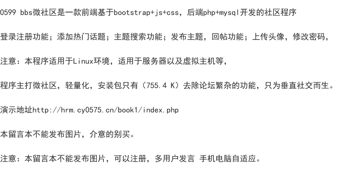 0599 bbs微社区是一款前端基于bootstrap+js+css,后端php+mysql开发的社区程序,登录注册功能;添加热门话题;主题搜索功能;发布主题,回帖功能;上传头像,修改密码,注意:本程序适用于Linux环境,适用于服务器以及虚拟主机等,程序主打微社区,轻量化,安装包只有(755.4 K)去除论坛繁杂的功能,只为垂直社交而生。演示地址http://hrm.cy0575.cn/book1/index.php 以萌养阵,方可长命百岁。 |
