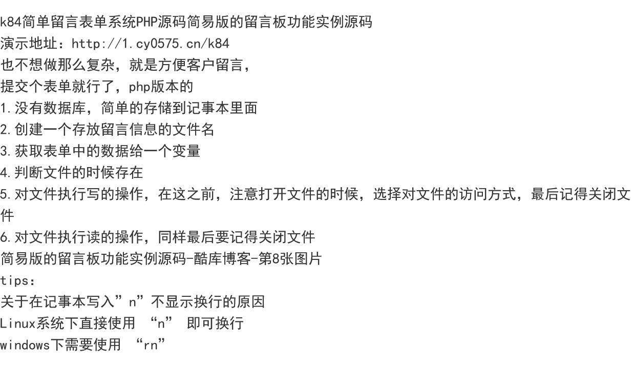 k84简单留言表单系统PHP源码简易版的留言板功能实例源码 演示地址:http://1.cy0575.cn/k84 也不想做那么复杂,就是方便客户留言, 提交个表单就行了,php版本的,修改了一下,分享出来,方便需要的人用到,也美化一下。 1.没有数据库,简单的存储到记事本里面 2.创建一个存放留言信息的文件名 3.获取表单中的数据给一个变量 4.判断文件的时候存在 5.对文件执行写的操作,在这之前,注意打开文件的时候,选择对文件的访问方式,最后记得关闭文件 6.对文件执行读的操作,同样最后要记得关闭文件 简易版的留言板功能实例源码-酷库***客-第8张图片 tips: 关于在记事本写入”n”不显示换行的原因 Linux系统下直接使用 “n” 即可换行 windows下需要使用 “rn” k84简单留言表单系统PHP源码简易版的留言板功能实例源码留言本 k84简单留言表单系统PHP源码简易版的留言板功能实例源码演示地址:http://1.cy0575.cn/k84也不想做那么复杂,就是方便客户留言,提交个表单就行了,php版本的,修改了一下,分享出来,方便需要的人用到,也美化一下。1.没有数据库,简单的存储到记事本里面2.创建一个存放留言信息的文件名3.获取表单中的数据给一个变量4.判断文件的时候存在5.对文件执行写的操作,在这之前,注意打开文件的时候,选择对文件的访问方式,最后记得关闭文件6.对文件执行读的操作,同样最后要记得关闭文件简易版的留言板功能实例源码-酷库***客-第8张图片tips:关于在记事本写入”n”不显示换行的原因Linux系统下直接使用 “n” 即可换行windows下需要使用 “rn” 以萌养阵,方可长命百岁。 |