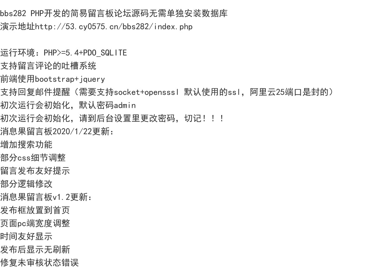 | 阅:70023 | 回:5 | bbs282 PHP开发的简易留言板论坛源码无需单独安装数据库 |