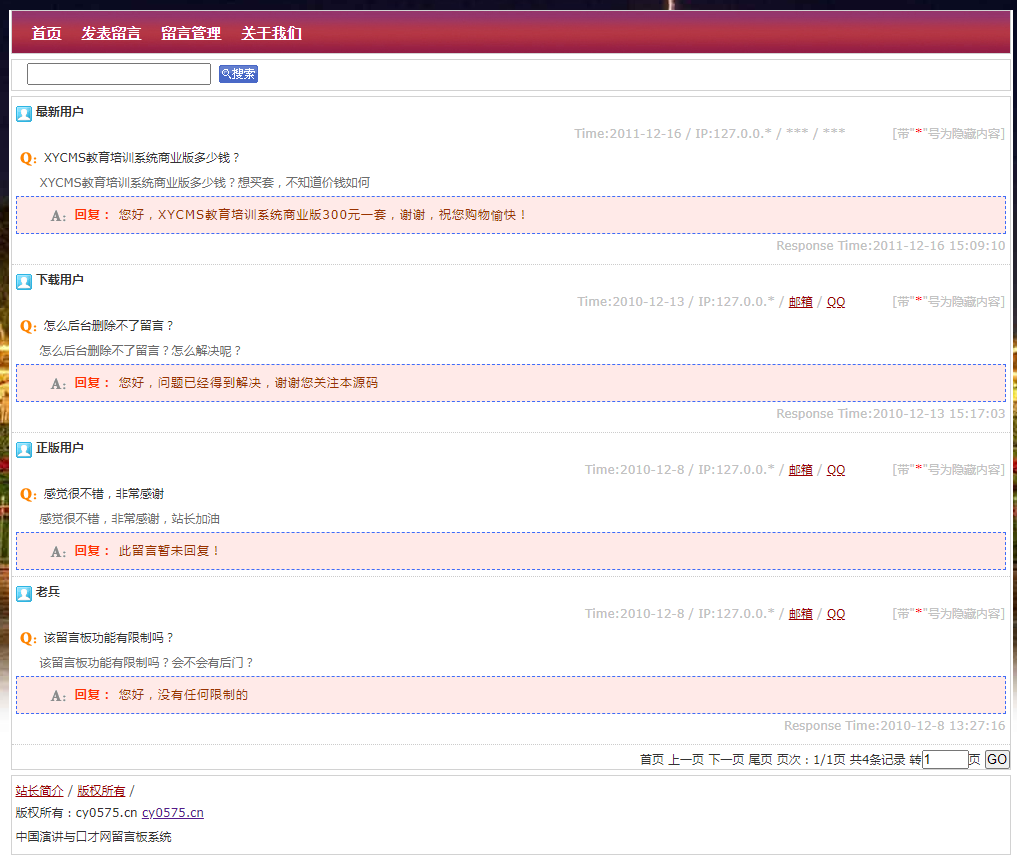 | 阅:82137 | 回:6 | 0653简约经典留言本留言板ASP-ACCESS源码留言源码后台简约管理 |