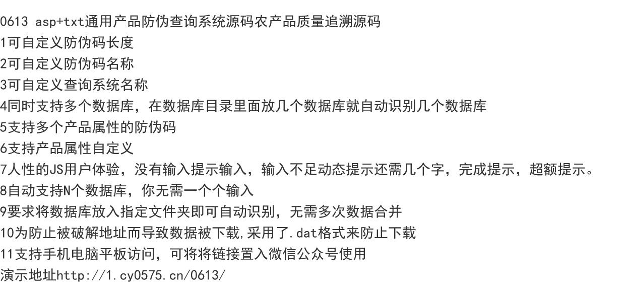 0613 asp+txt通用产品防伪查询系统源码农产品质量追溯无后台直查 ![]() 以萌养阵,方可长命百岁。 |