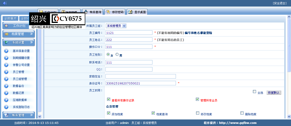 档案信息源码 工作计划源码 人员档案存放信息源码 员工档案0087 1、工作计划记录:新增工作计划 工作计划列表 2、档案管理:新增档案,档案管理,档案相关信息。 3、档案警示:到期提醒 4、员工资料管理。 5、账务管理。 演示地址: http://cy0575.3vzhuji.com/0087 http://web.cy0575.com/0087/ 用户名及密码:1122 1122 http://web.cy0575.com/0087/ 以萌养阵,方可长命百岁。 |