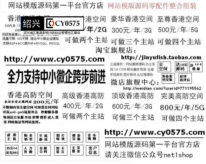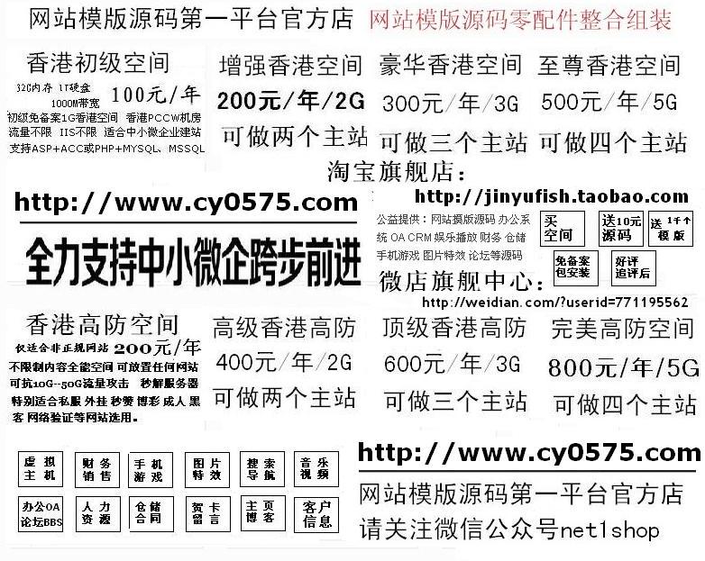 香港高防空间,抗攻击,抗投诉,无限制内容,安全,稳定,可靠!1G200元/年。网站模板源码空间主机淘宝店http://jinyufish.taobao.com 以萌养阵,方可长命百岁。 |