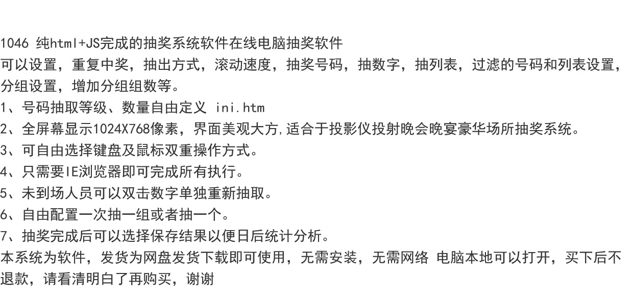 1046 纯html+JS完成的抽奖系统软件在线电脑抽奖软件 ![]() 以萌养阵,方可长命百岁。 |