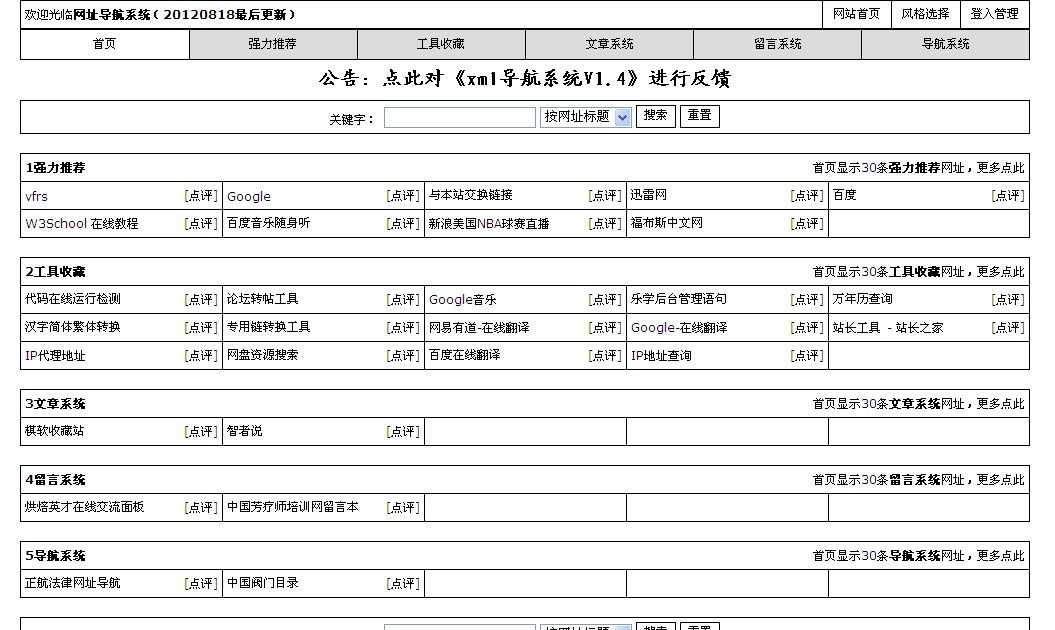程序架构:ASP + XML + gb2312 + JScript 程序功能:添加链接、修改链接、删除链接、发表评论、删除评论、回复评论、清空链接、清空评论、搜索功能、管理链接、管理评论、管理分类、文件上传、风格选择等。 安装方法:下载后,解压到一个文件夹中,设置一下config.asp里面的参数,然后将此文件夹所有的文件直接上传到您的网站的某个目录下即可。 演示地址:http://www.vfrs.cn/xmlsites/ 默认管理员用户名***,密码管理员*** 程序升级:覆盖除data目录下文件外的所有文件。 --------------------------------------------- V1.0版功能: (20080719) 1、用户功能(查看链接)。 2、管理功能(添加链接、修改链接、删除链接、清空链接)。 3、top.asp及foot.asp分别为网站的顶部与底部,为了网站的效果请做适当修改。 V1.1版功能: (20081230) 1、添加、修改链接时增加UBB编辑器及文件上传。 2、添加网站参数设置,实现无须通过修改文件来设置网站参数。 3、增加文章评论功能及回复评论功能。 4、增加文章系统的风格选择。也就是美化。 5、修正其它一些细节之处。 V1.2版功能: (20090113) 1.增加导航顶部分类;(感谢群内用户“金***教练”反馈) 2.每行控制显示网址数;(感谢群内用户“金***教练”反馈) 3.增加分类在线管理; 4.修正其它一些细节之处。 V1.3版功能: (20090212) 1.分类到一定数量,自动换行; 2.增加搜索功能; 3.在首页增加“一点就去”,照顾老顾客; 4.首页每个分类的网址数目可以确定,设置“更多”链接,链接该分类的全部网址,以保证首页不过长。 V1.4版功能: (20120818) 1.cookies方便管理者管理; 2.修正删除文章后评论未删除的问题; 3.修正其它一些细节之处。 演示地址: http://web.cy0575.com/0168 以萌养阵,方可长命百岁。 |