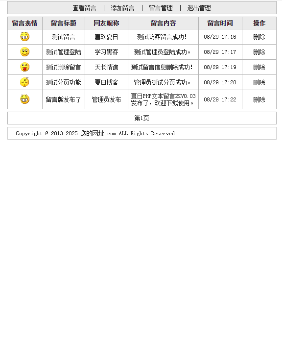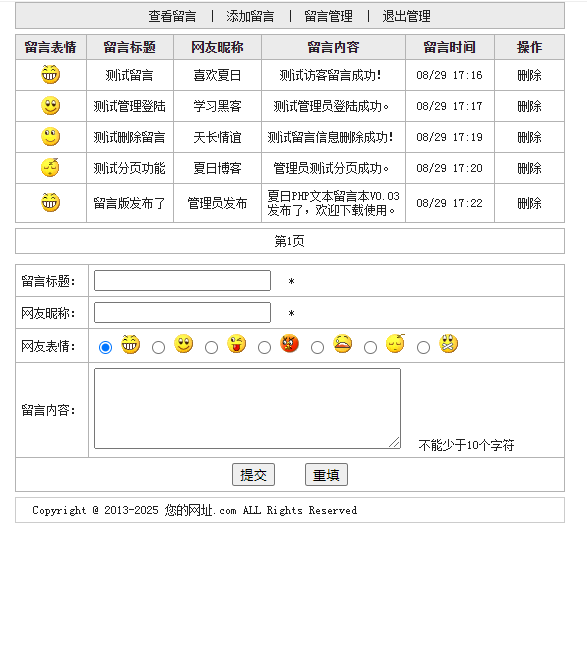 c69php无数据库文本留言本php+txt的文本留言本源码, 一个php+txt的文本留言本,只有一个.php即可实现对留言本的显示,添加与删除,按照一定规则存储到.txt文本中,利用了数组将留言内容读取出来,整个留言板程序只有十几KB,源码也没多少行,还可以实现留言本的表情显示,主要是利用PHP的文件操作函数实现留言本程序的操作,页面非常美观,可作为一个小型的留言本研究使用。 PHP文本留言本V0.03除了具有前两版所有功能外,优化了源代码,主要增加了分页显示,登陆即可对文本留言信息进行删除,可直接应用到网站中,适应应用在没有 Mysql 数据库的空间中。 PHP文本留言本V0.03采用 txt 作为数据库,可直接放到支持 PHP 空间中,而不需要使用 Mysql 数据库,数据完全保存到 txt 文本中。 管理员密码 ***,演示地址http://www.cy0575.cn/book2 以萌养阵,方可长命百岁。 |