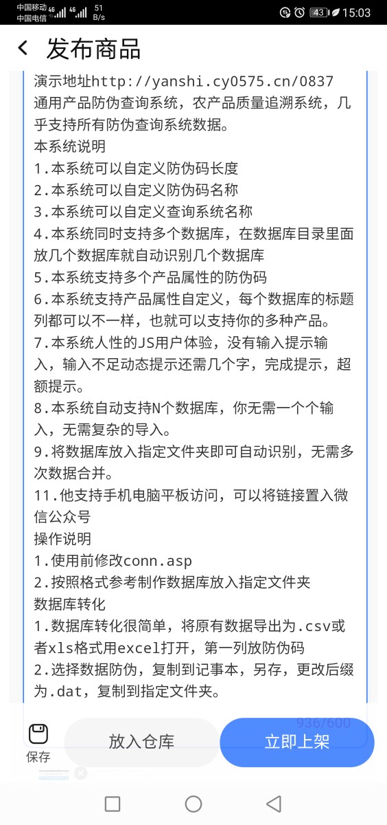 这是个非常通用的产品防伪查询系统,农产品质量追溯系统,几乎支持所有防伪查询系统数据。 本系统说明 1.本系统可以自定义防伪码长度,修改一处数字即可实现 2.本系统可以自定义防伪码名称,修改一处几个汉字即可实现 3.本系统可以自定义查询系统名称,修改一处几个汉字即可实现 4.本系统同时支持多个数据库,在数据库目录里面放几个数据库就自动识别几个数据库 5.本系统支持多个产品属***的防伪码,比如有些是五个属***,有些是六个七个属*** 6.本系统支持产品属***自定义,每个数据库的标题列都可以不一样,也就可以支持你的多种产品。 7.本系统人***的JS用户体验,没有输入提示输入,输入不足动态提示还需几个字,完成提示,超额提示。 8.本系统自动支持N个数据库,你无需一个个输入,无需复杂的导入。 9.安要求将数据库放入指定文件夹即可自动识别,无需多次数据合并。 10.为了防止被破解地址而导致数据被下载,采用了.dat格式来防止下载。 11.他支持手机,电脑,平板访问,可以将将链接置入微信公众号使用。 操作说明 1.使用前修改conn.asp 按照提示说明操作。 2.按照格式参考制作数据库放入指定文件夹/data/。 数据库转化说明 1.数据库转化很简单,将原有数据导出为.csv或者xls格式用excel打开,第一列放防伪码 2.选择数据防伪,复制到记事本,另存,更改后缀为.dat,复制到指定文件夹。 以萌养阵,方可长命百岁。 |