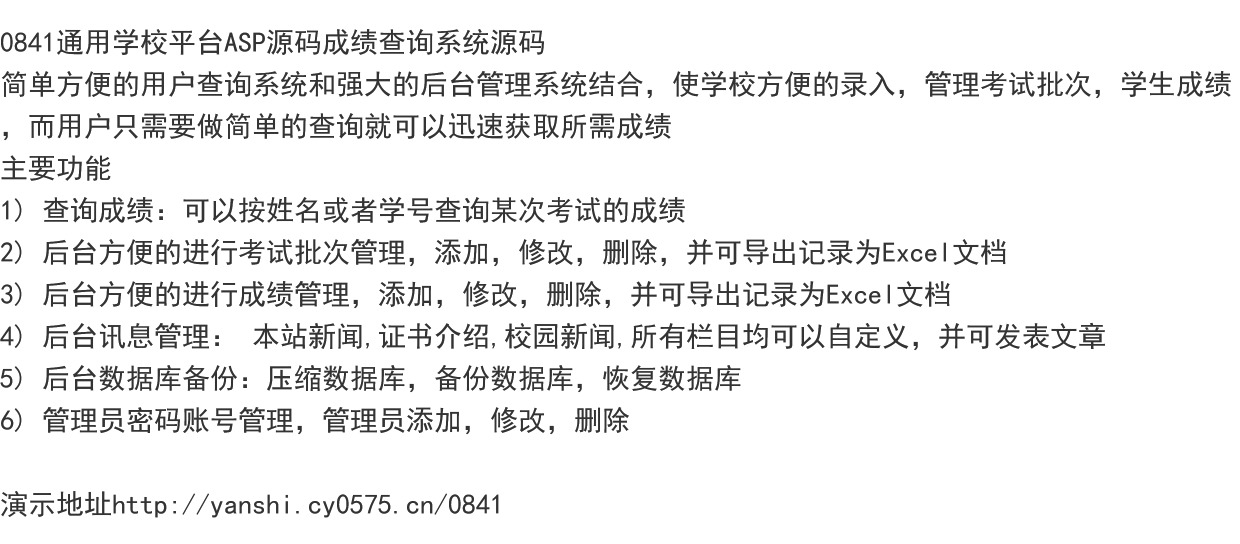 0841通用学校平台ASP源码成绩查询系统源码 简单方便的用户查询系统和强大的后台管理系统结合,使学校方便的录入,管理考试批次,学生成绩, 而用户只需要做简单的查询就可以迅速获取所需成绩。 【主要功能特色】 1) 用户查询成绩:可以按姓名或者学号查询某次考试的成绩 2) 后台方便的进行考试批次管理,添加,修改,删除,并可导出记录为Excel文档 3) 后台方便的进行成绩管理,添加,修改,删除,并可导出记录为Excel文档 4) 后台最新讯息管理: 本站新闻,证书介绍,校园新闻,所有栏目均可以自定义,并可发表文章,新闻消息 5) 后台数据库备份:压缩数据库,备份数据库,恢复数据库 6) 管理员密码账号管理,管理员添加,修改,删除.演示地址http://yanshi.cy0575.cn/0841 以萌养阵,方可长命百岁。 |