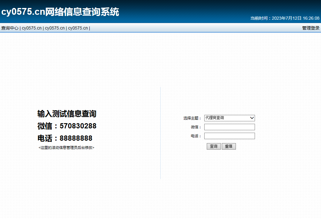 0835客户信息登记成绩登记工资登记招生登记网络信息查询系统ASP源码,主要功能: 可以作为人事查询、成绩查询、工资查询、招生查询、订单查询等。 主要特点: 可以增加管理员和录入员,每个录入可以单独设置权限对应主题 可设置多个查询主题,查询信息的字段可设置,查询结果显示内容可设置、每个字段可以设置模式(如下拉选择框、单行文本框、日期框等),演示地址http://yanshi.cy0575.cn/0835/ 以萌养阵,方可长命百岁。 |