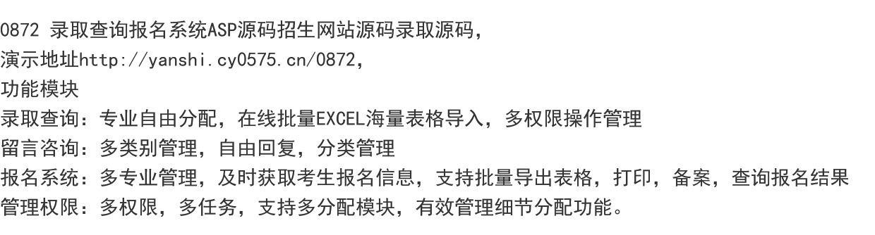 | 阅:86412 | 回:9 | 0872 录取查询报名系统ASP源码招生网站源码录取源码 |
