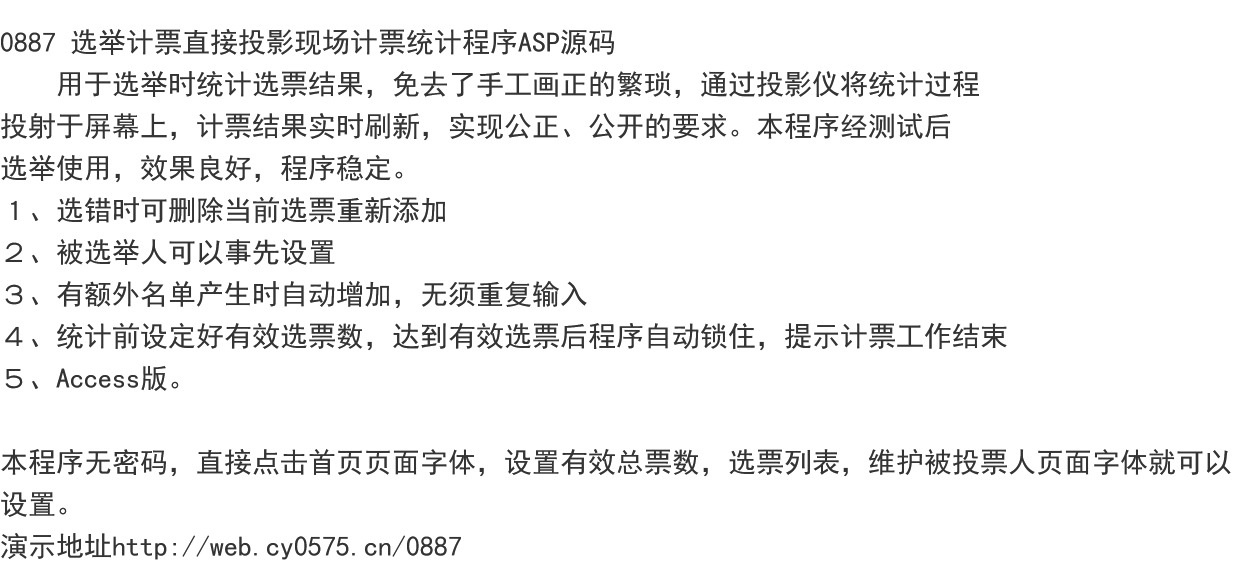 | 阅:82322 | 回:6 | 0887 选举计票直接投影现场计票统计程序ASP源码 |