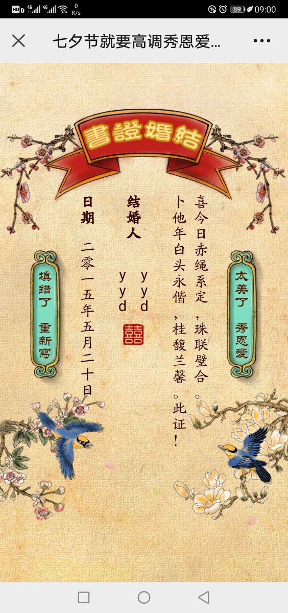 | 阅:75354 | 回:6 | 0924 高调秀恩爱结婚证书源码制作婚书手机滑动HTML源码 |