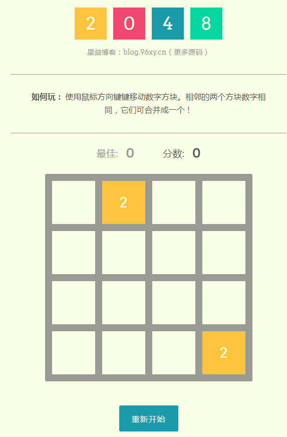 0952-33 2048游戏HTML网站游戏源码,如何玩: 使用鼠标方向键键移动数字方块。相邻的两个方块数字相同,它们可合并成一个!演示地址http://job.cy0575.cn/1/0952-33/ 以萌养阵,方可长命百岁。 |