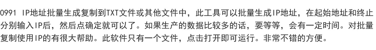 | 阅:63293 | 回:2 | 0991 IP地址批量生成复制到TXT文件或其他文件工具批量生成IP地址.. |