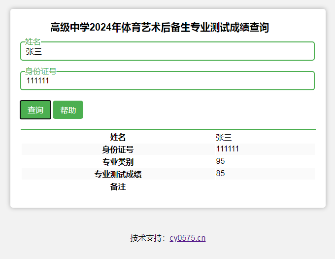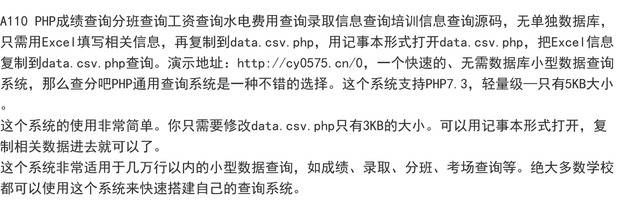 A110 PHP成绩查询分班查询工资查询水电费用查询录取信息查询培训信息查询源码,无单独数据库,只需要用Excel填写相关信息,再复制到data.csv.php,用记事本形式打开data.csv.php,把Excel信息复制到data.csv.php里面即可查询。演示地址:http://cy0575.cn/0,一个快速的、无需数据库的小型数据查询系统,那么查分吧PHP通用查询系统是一种不错的选择。这个系统支持PHP7.3,并且非常轻量级——只有5KB大小。 这个系统的使用非常简单。你只需要修改data.csv.php文件中的内容,就可以准备好演示数据和说明。输出的查询页面也非常精简,只有3KB的大小。可以用记事本形式打开,复制相关数据进去就可以了。 这个系统非常适用于几万行以内的小型数据查询,如成绩、录取、分班、考场查询等。绝大多数学校都可以使用这个系统来快速搭建自己的查询系统。 以萌养阵,方可长命百岁。 |