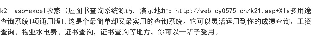k21 asp+excel农家书屋图书查询系统源码无数据库Excel上传就可查 以萌养阵,方可长命百岁。 |